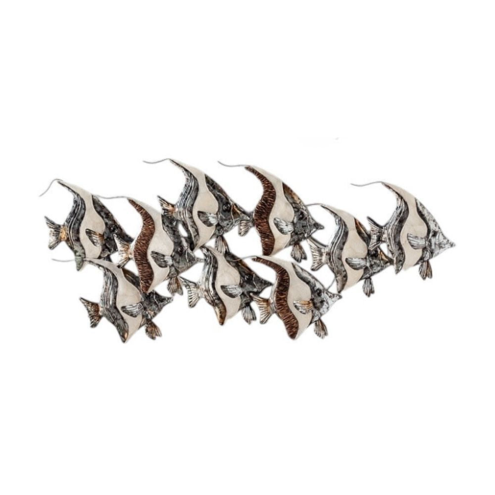 Transform your wall with the Capiz/Abaca Long School Banner Fish Wall Art, a handcrafted masterpiece that captures the graceful rhythm of the sea. This design showcases a flowing formation of banner fish, rendered in luminous Capiz shell and rustic abaca. The elongated composition makes it a stunning focal point, ideal for coastal homes or anyone seeking an elegant marine-inspired accent.Â